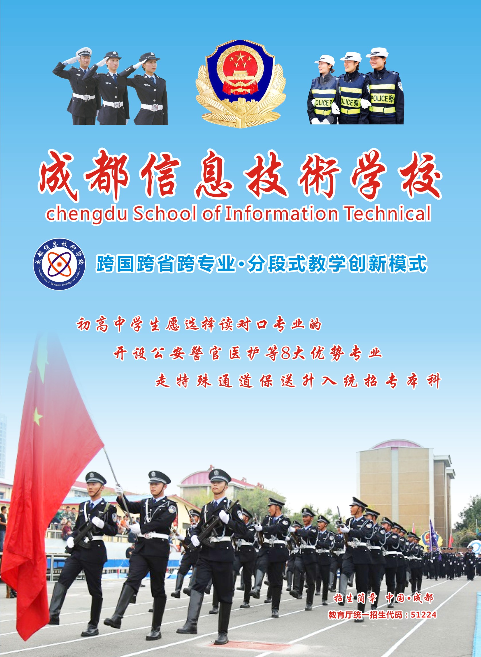 學(xué)校與黃埔警校、人民警察干部學(xué)校強(qiáng)強(qiáng)聯(lián)合,組建了一支團(tuán)結(jié)和諧、積極向上的團(tuán)隊(duì),師資力量雄厚,用合理科學(xué)的管理模式對學(xué)生進(jìn)行思維、人文、素質(zhì)及文化等方向進(jìn)行提升。學(xué)校與各高校強(qiáng)強(qiáng)聯(lián)合,并聘請我校的聯(lián)辦高校優(yōu)秀的教師或教授不定期的到校為學(xué)生授課,如:四川師范大學(xué)、成都信息工程大學(xué)、電子科技大學(xué)等。同時(shí)學(xué)校多元化的將學(xué)生按專業(yè)類別規(guī)劃到我校的相應(yīng)校區(qū)就讀,實(shí)施文化課+綜合素質(zhì)課程學(xué)習(xí),保送學(xué)生進(jìn)入統(tǒng)招大學(xué),為實(shí)現(xiàn)中華民族偉大復(fù)興的中國夢、我的夢不懈奮斗。