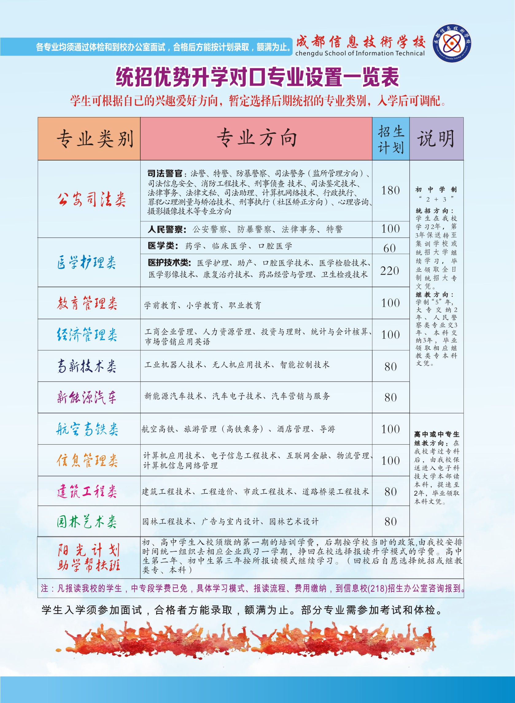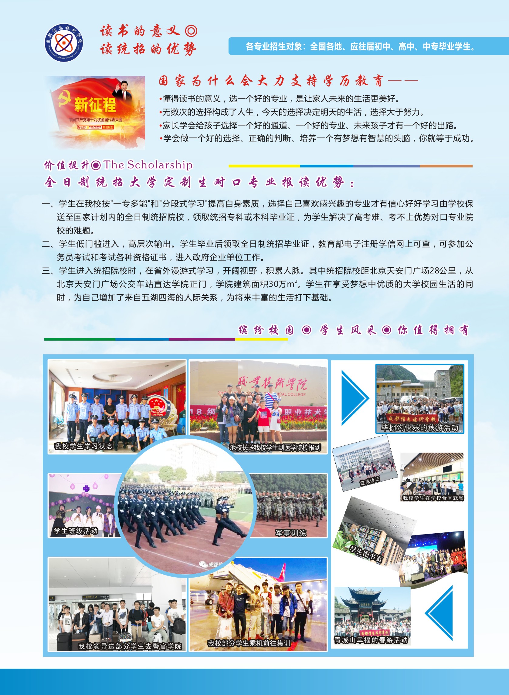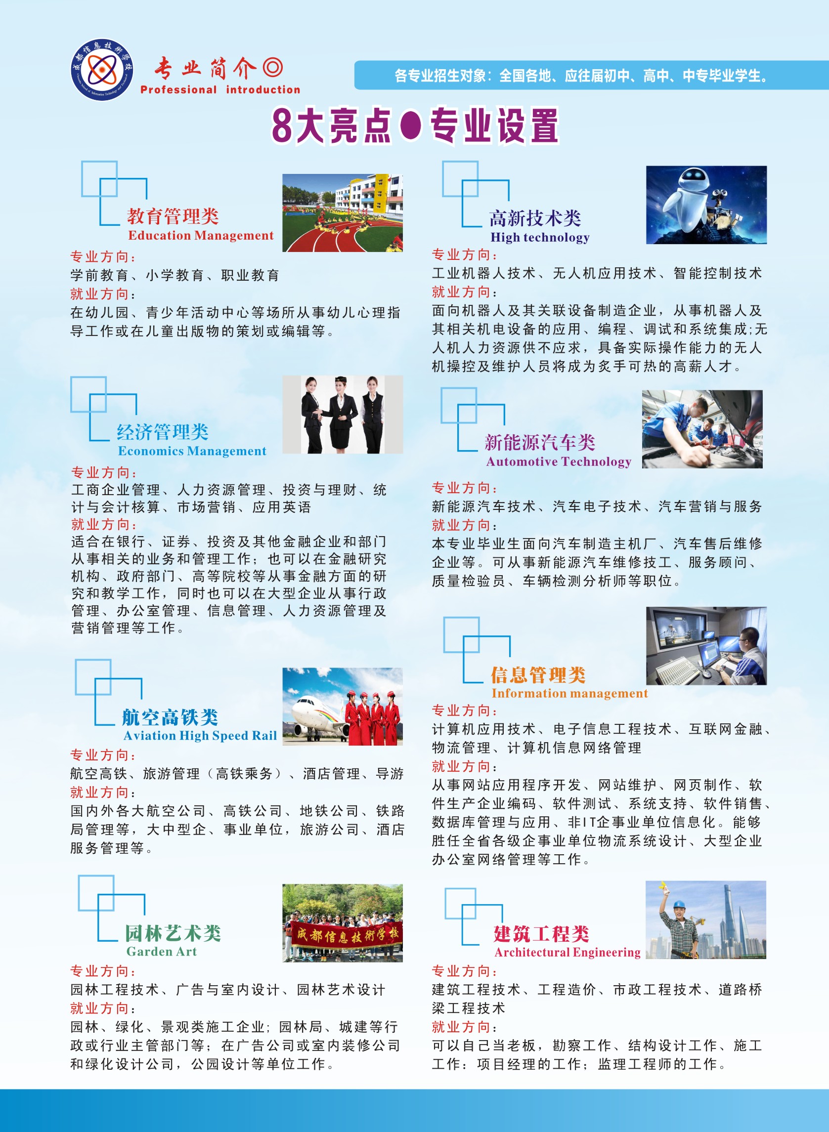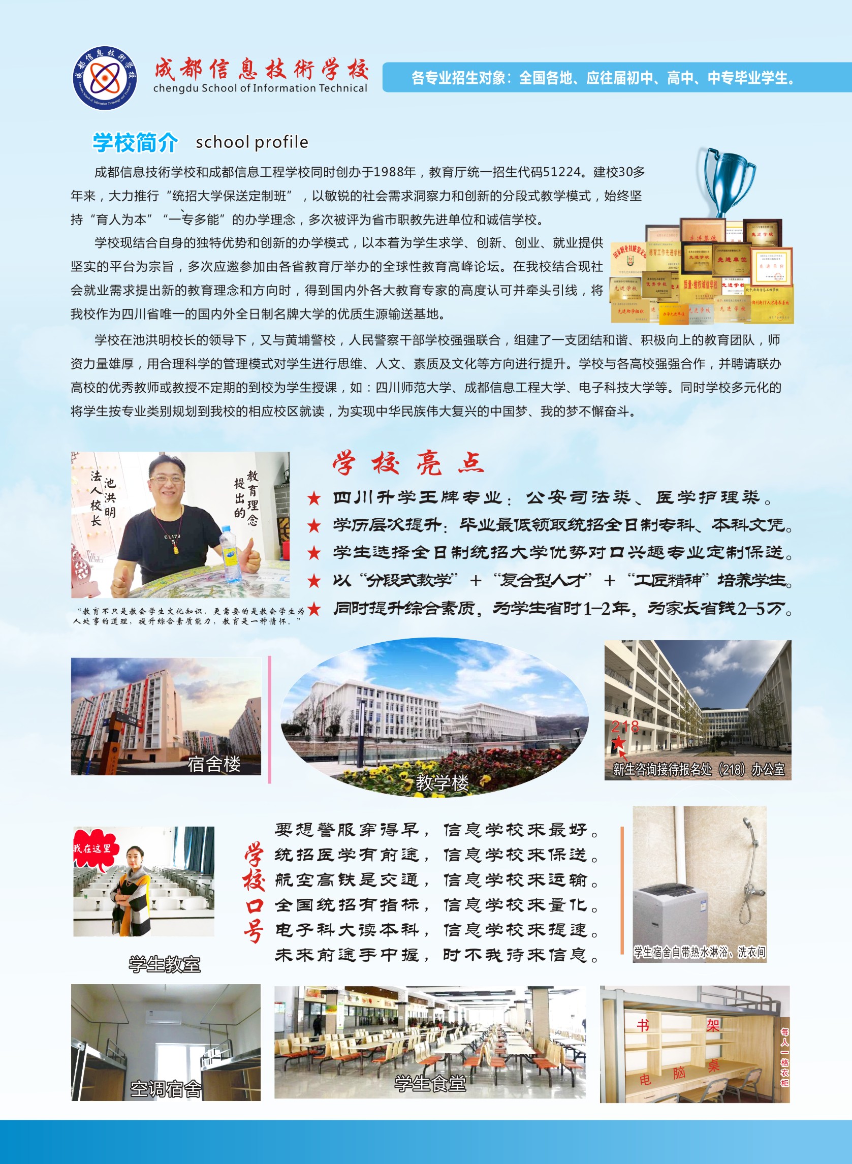 成都信息技術(shù)學(xué)校與成都信息工程學(xué)校同時(shí)創(chuàng)辦于1988年,教育廳統(tǒng)一招生代碼51224。建校30多年來,大力推行“統(tǒng)招大學(xué)保送定制班”,以敏銳的社會需求洞察力和創(chuàng)新的分段式教學(xué)模式,始終堅(jiān)持“育人為本”的辦學(xué)理念,多次被評為省市職教先進(jìn)單位和誠信學(xué)校。