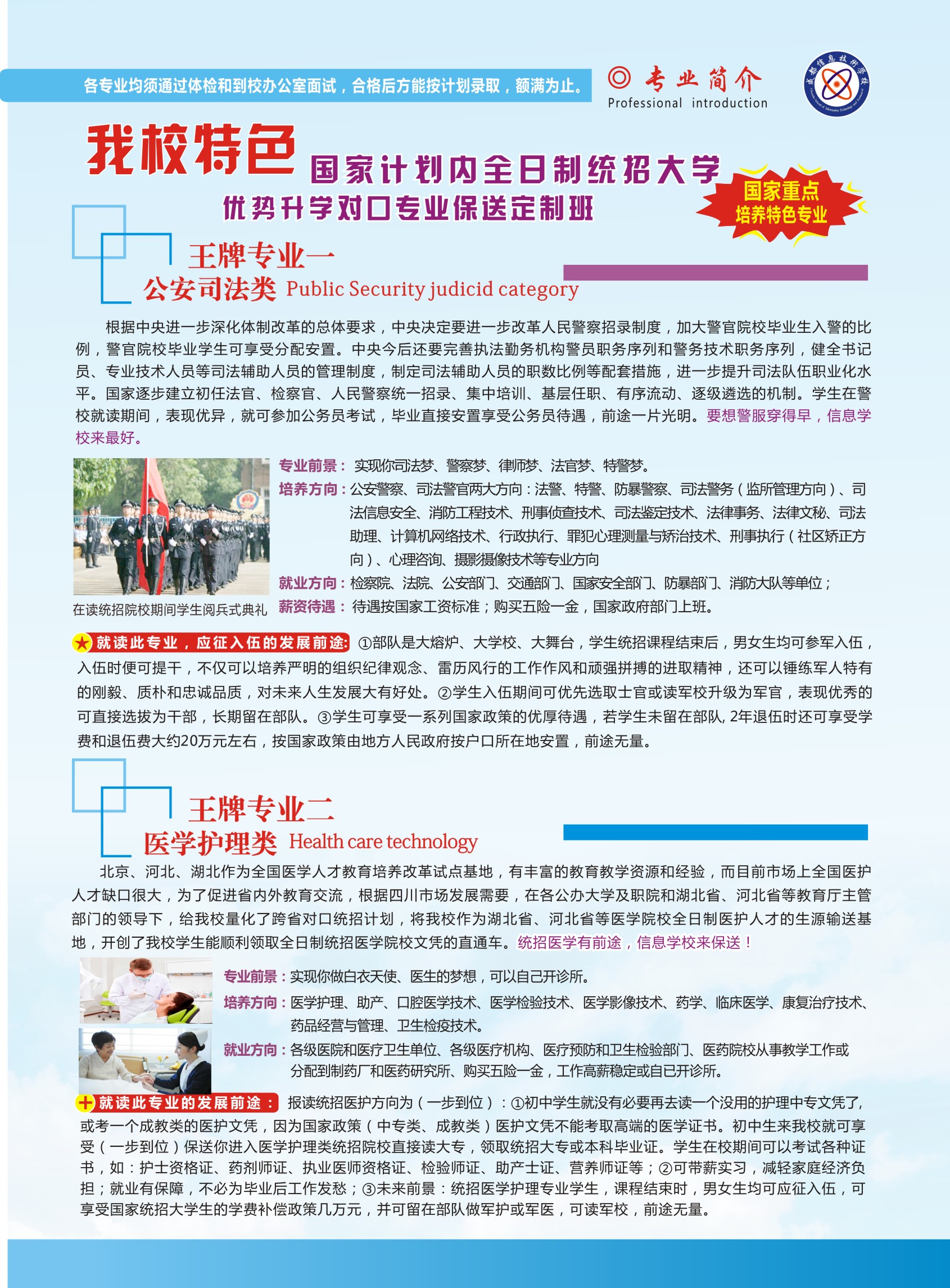 學(xué)校現(xiàn)結(jié)合自身的獨(dú)特優(yōu)勢和創(chuàng)新的辦學(xué)模式,以本著為學(xué)生求學(xué)、創(chuàng)新、創(chuàng)業(yè)、就業(yè)提供堅(jiān)實(shí)的平臺為宗旨,多次應(yīng)邀參加由各省教育廳舉辦的全球性教育高峰論壇。在我校結(jié)合現(xiàn)社會就業(yè)需求提出新的教育理念和方向時(shí),得到國內(nèi)外各大教育專家的高度認(rèn)可并牽頭引線,將我校作為四川省唯一的國內(nèi)外全日制名牌大學(xué)的生源輸送基地,在我校就讀的學(xué)生享受國家統(tǒng)招計(jì)劃內(nèi)優(yōu)勢對口專業(yè)培養(yǎng)和保送,為畢業(yè)學(xué)生可領(lǐng)取全日制統(tǒng)招文憑開了直通車。